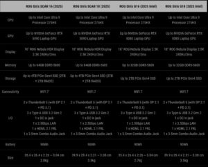 Краткие технические характеристики: 2025 ROG Strix SCAR 16 / SCAR 18 и G16 (Intel 2025) / G18 (Intel 2025)